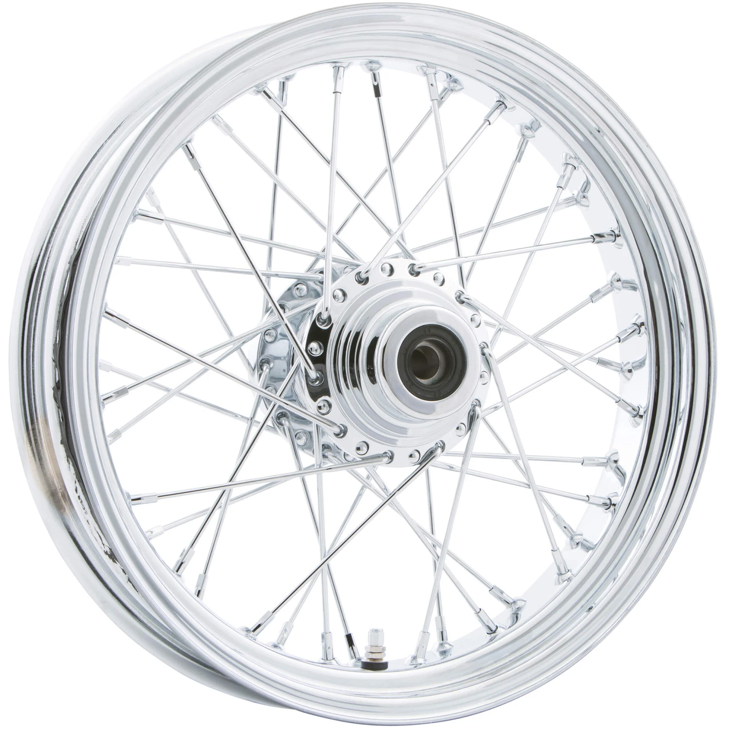 HardDrive Gloss Black and Chrome Spoked wheels are laced in a standard 40-Spoke pattern. Wheels come complete with spoke sealant, Chrome valve stem, inner sleeve and sealed wheel bearings (except the `84-99 fitment which comes with ¾” Timken bearings with an outer seal installed – greasing is required)