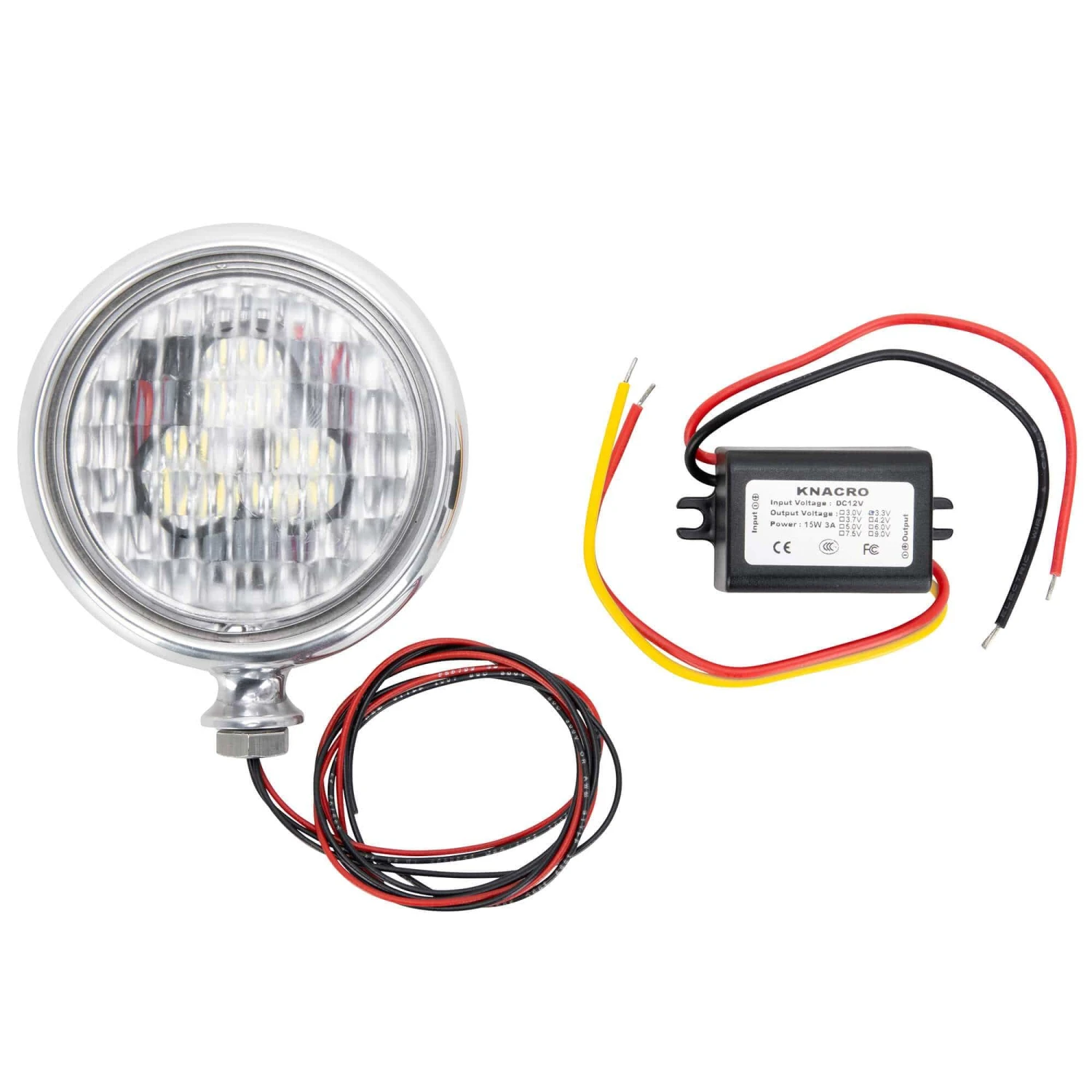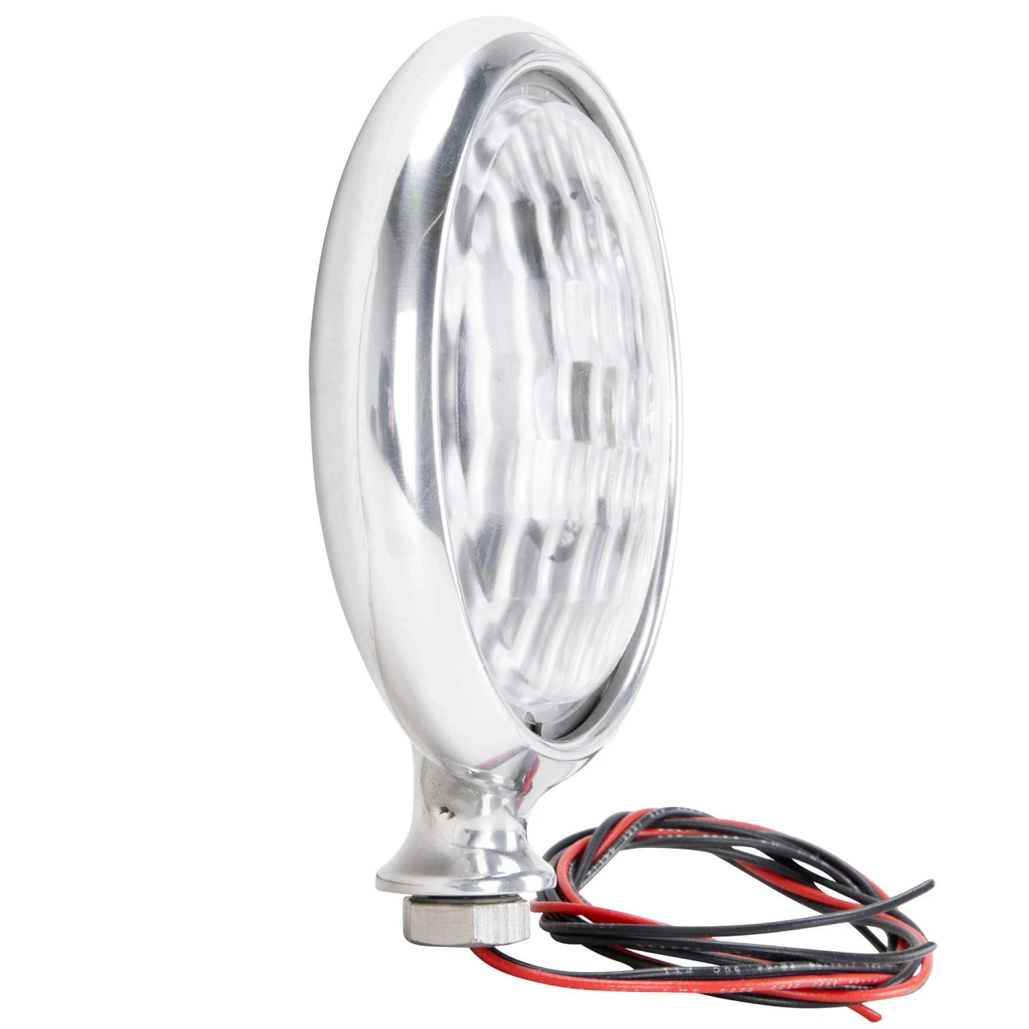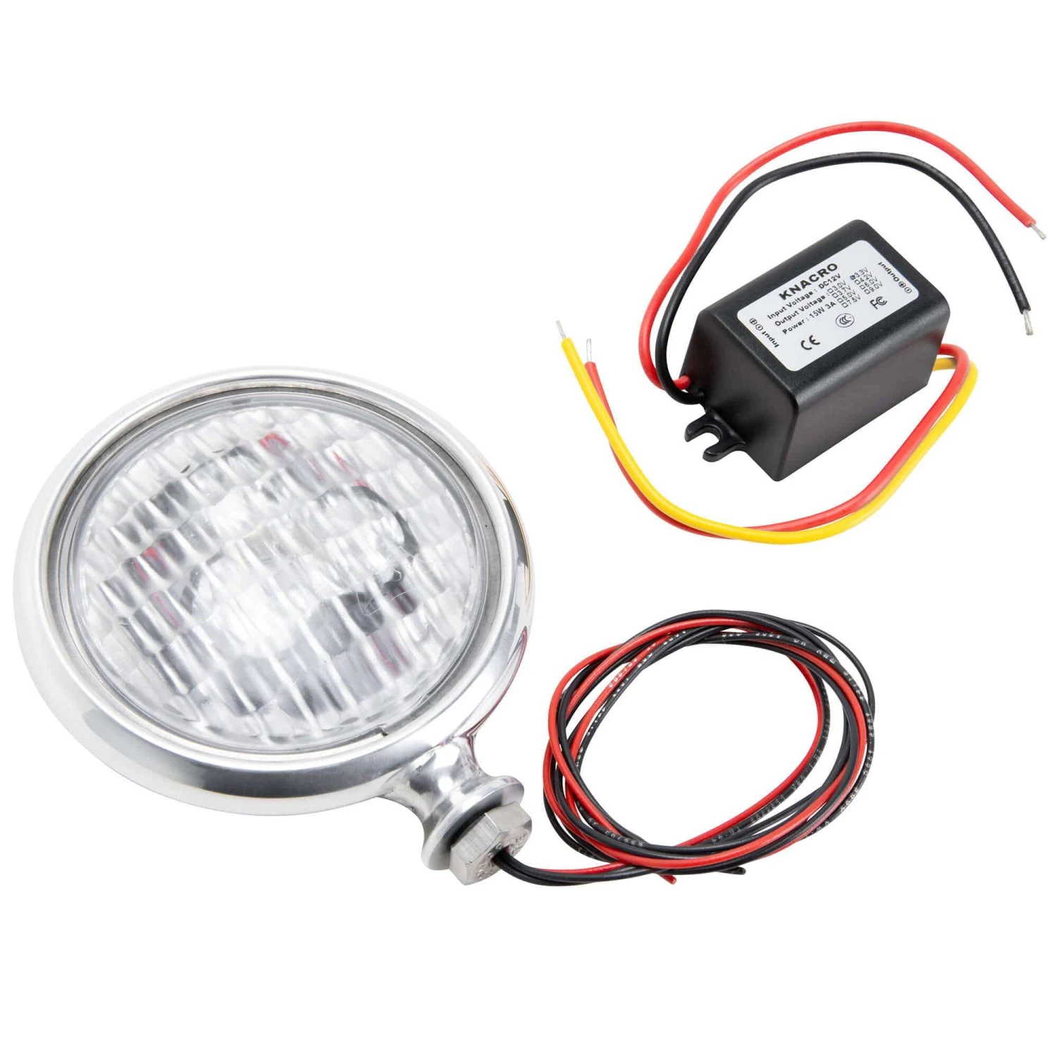 The lights are right at 3” diameter with a super slim profile! These are made right here in USA with antique style lenses. The headlights are 1300 lumen LED lights inside a custom made housing with the vintage style lens. These feature a high/low beam 3 wire setup and require an included voltage converter box that is easily hidden. Fully polished to a mirror finished aluminum. Sold each light.