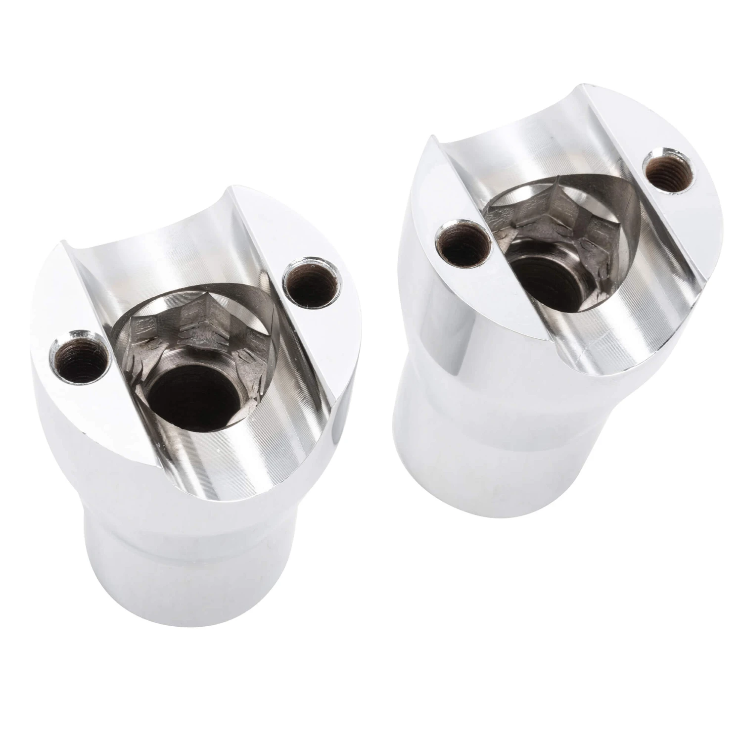 Chrome tapered steel riser set with a through bolt design for use with 41mm panhead and shovelhead trees. These accommodate a 1″ handlebar and are made for custom applications. Chrome plated steel. Sold in pairs.
