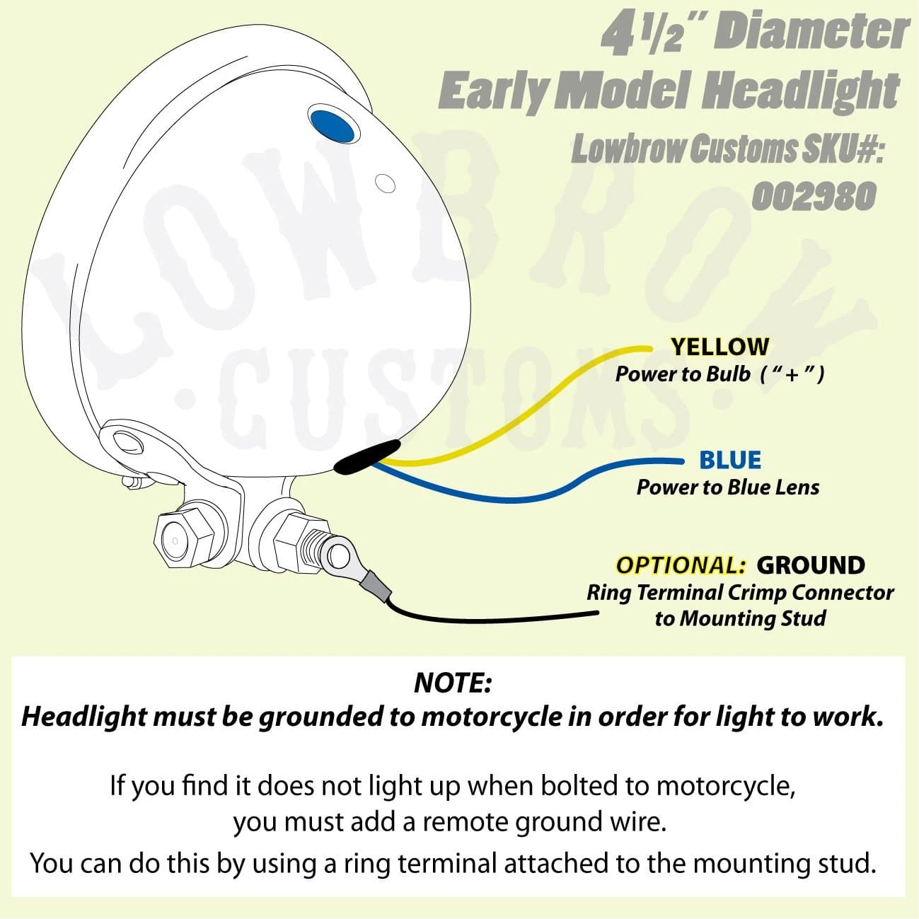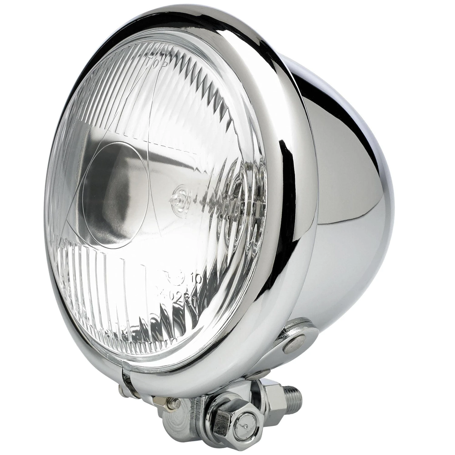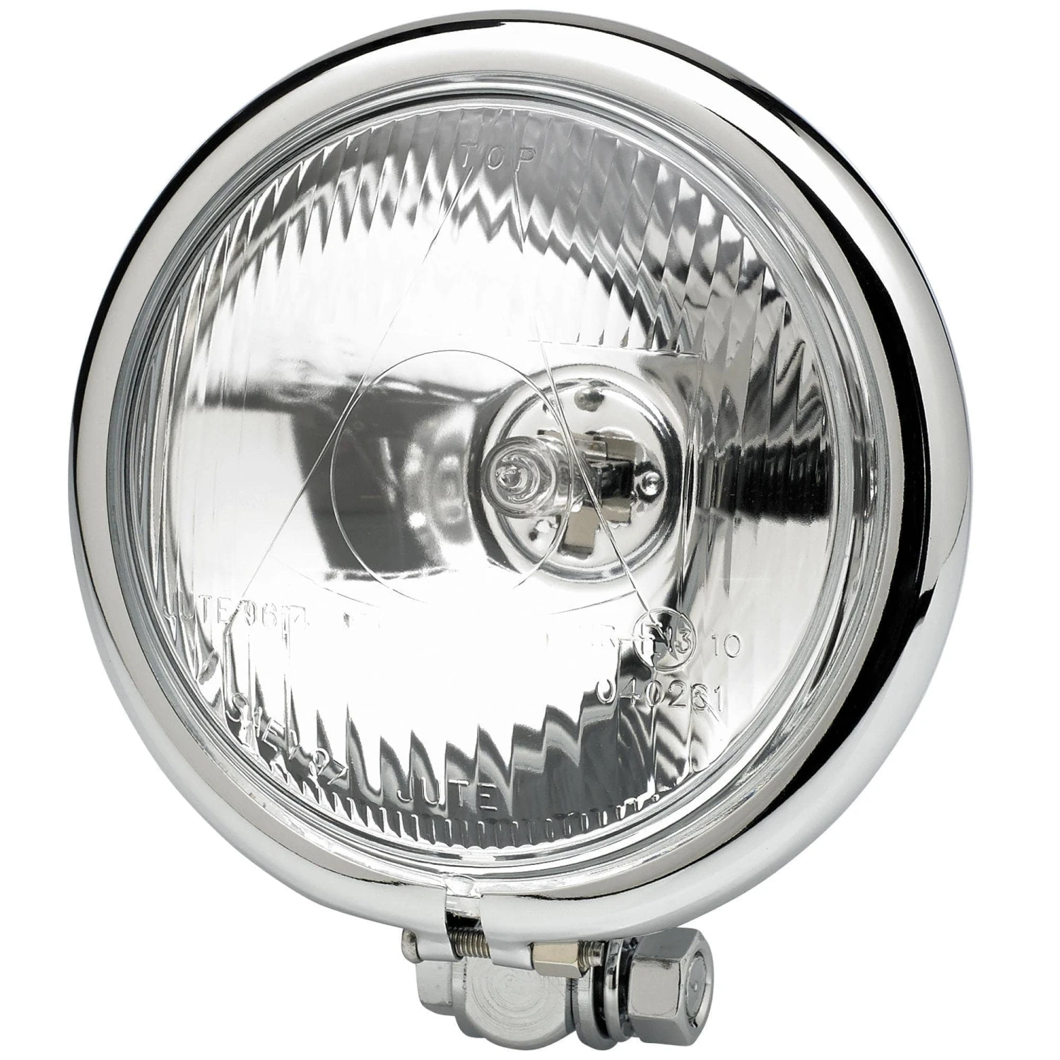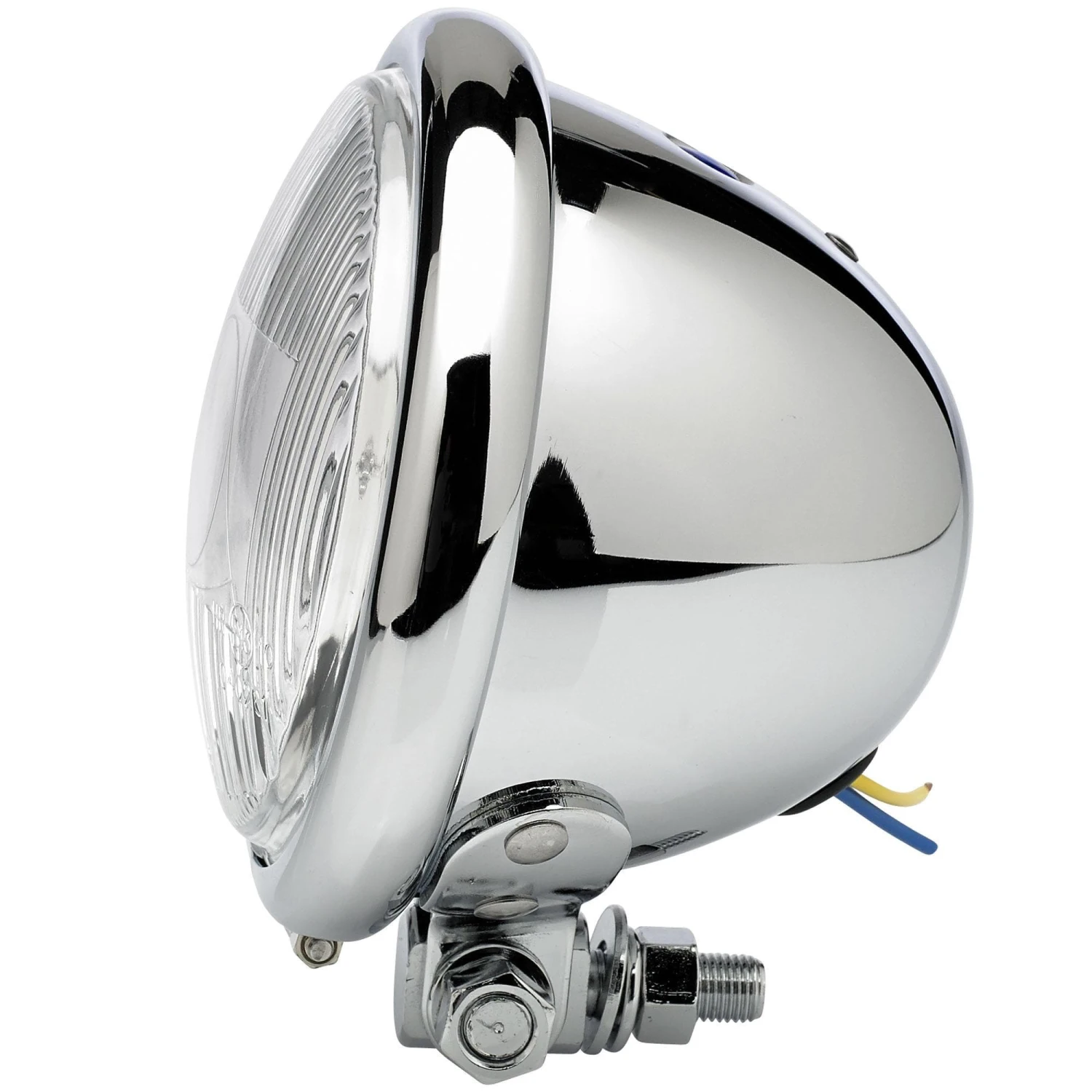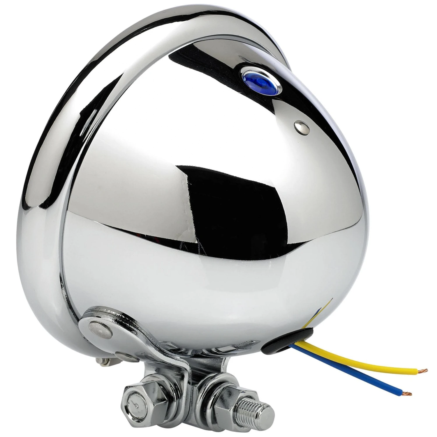 Use this 4-1/2″ diameter chrome light as an auxiliary spot light or a headlight for your chopper or cafe racer. Bottom mount, swivel stud mounting. Comes wired up complete with an H3 12 volt single beam 55 watt halogen bulb. You can find the