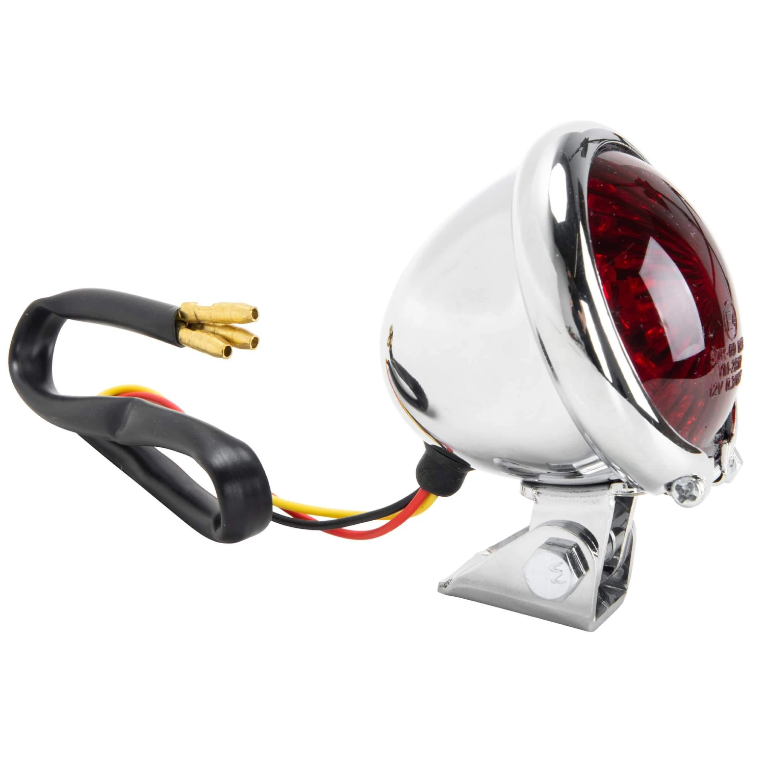 Simple and clean, this 12 Volt Bates style tail light features a chrome housing with a red plastic lens and LED lights inside for increased visibility. Dual intensity LEDs so this operates as a running AND brake light. The diameter of this