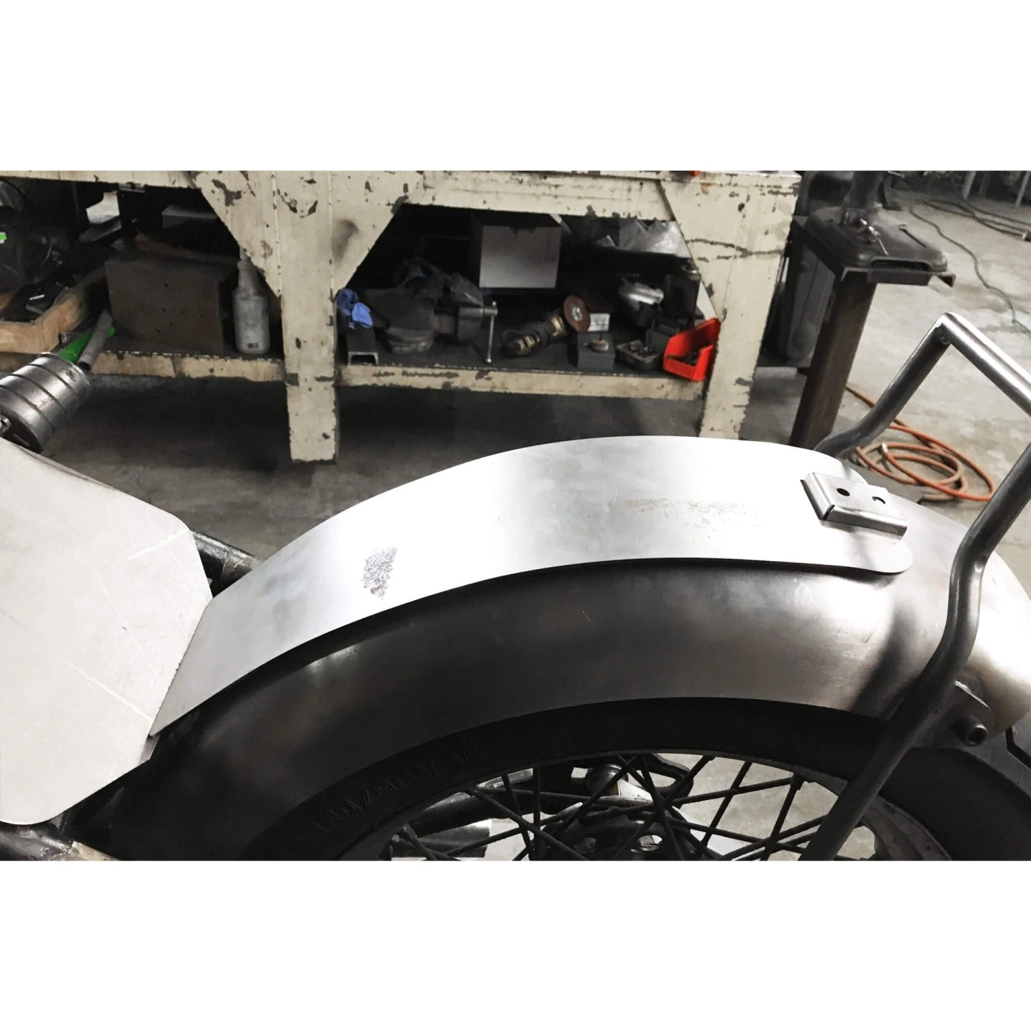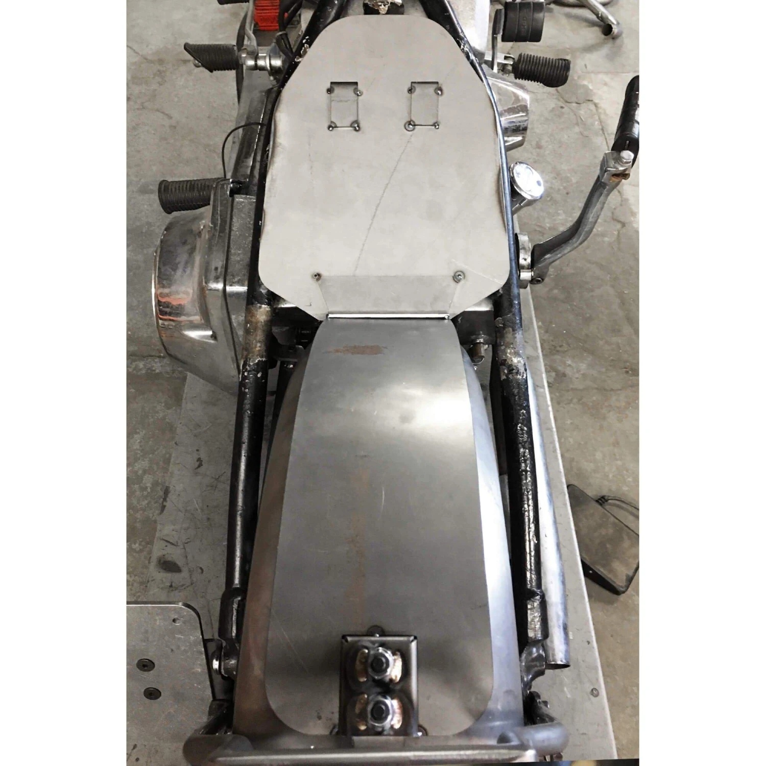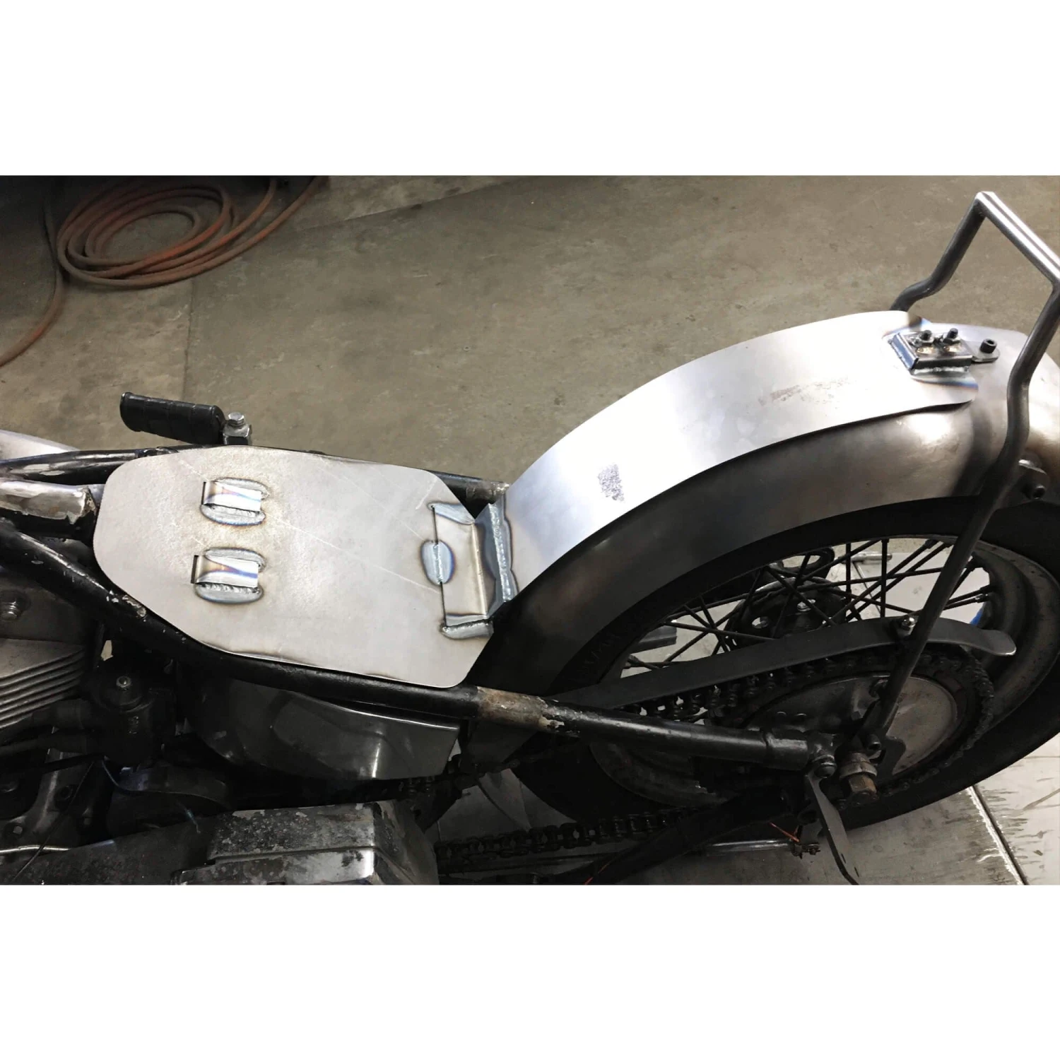 This chopper seat pan kit comes with everything needed to fabricate and mount a custom seat pan. This seat pan is designed to work perfectly with stock rigid Harley frames but will work on most any model motorcycle. Comes in bare steel and ready to modify, mount, and finish in any way you can think of. The pan is approx. 15 gauge steel and the brackets are approx 11 gauge . Made in Ohio, USA.