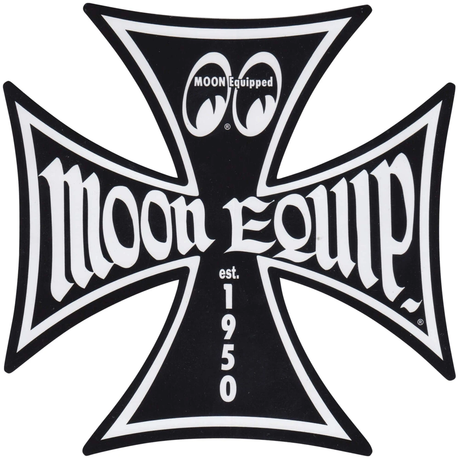 Mooneyes Equipped Maltese Iron Cross sticker/decal. Available in Red or Black, in 3″ (small), or 5″ (large) sizes.