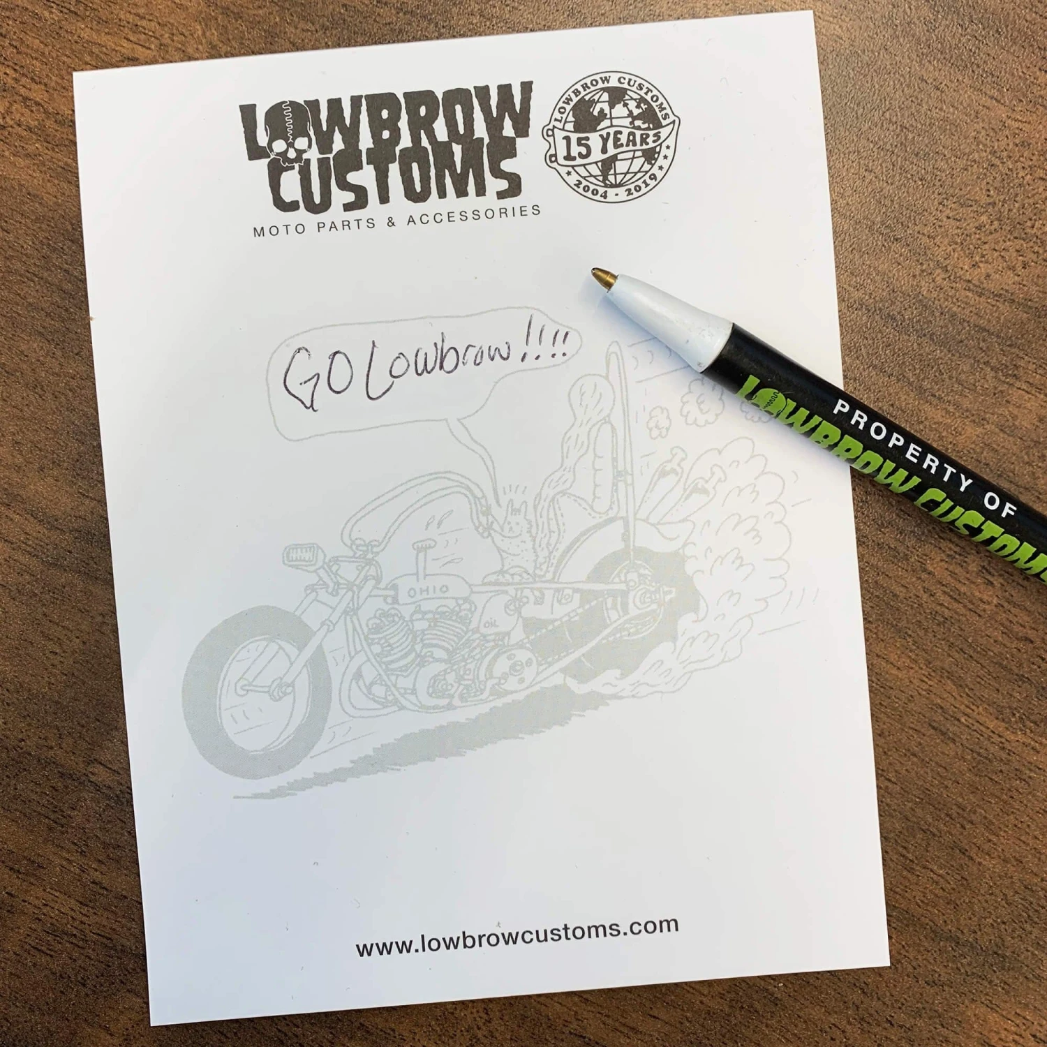 Everyone needs a notepad whether it is in the shop or garage, kitchen, office, or wherever! You can grab your Lowbrow Customs Notepad with art by Maxwell Paternoster here. Made right here in Ohio, USA. 50 pages, measure 5.5″ x 4.25″