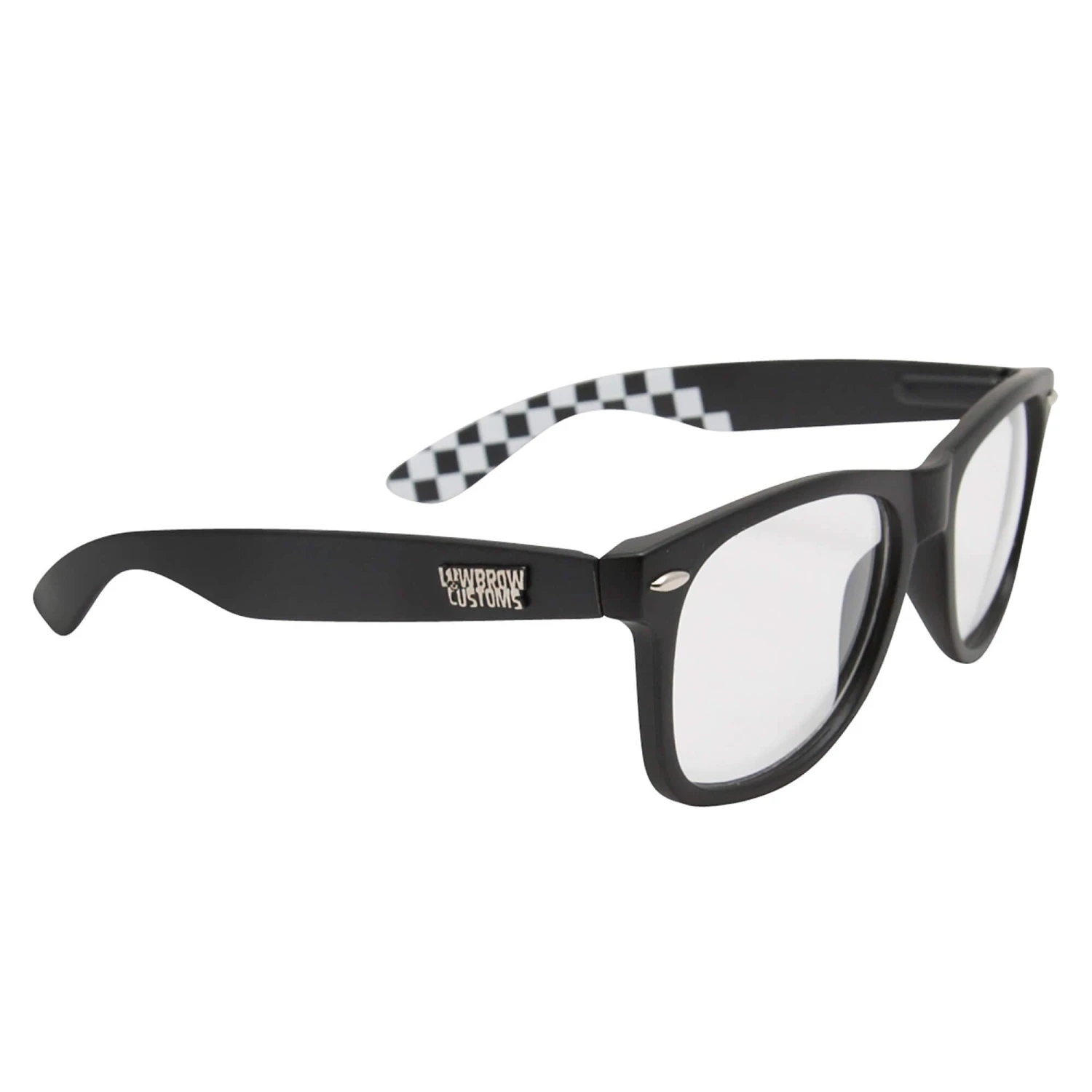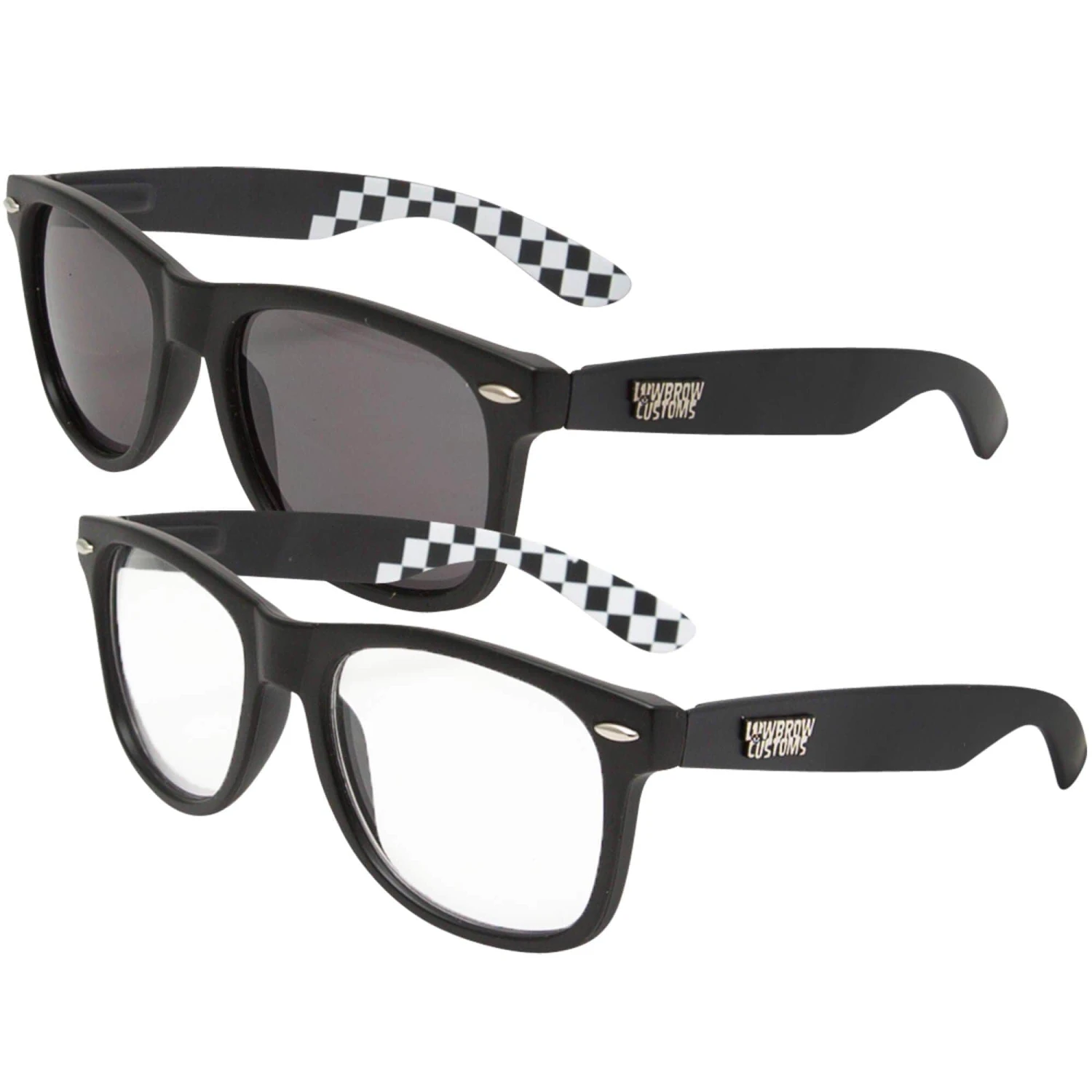 Get a pair of Lowbrow Customs Originals Sunglasses for the day, and a pair of Black Clears Riding Glasses for night in this set and save 5 dollars! Lowbrow Customs sunglasses are ideal for riding your moto or jamming around town, regardless of mode of transport. They hold up to the daily rigors of the average 21st century S.O.B. while remaining reasonably-priced and oozing classic style. Quality touches like articulated spring hinges, small, raised Lowbrow Customs logos, and a subtle checkerboard imprint on the inside of the arms add style to substance. Micro-fiber storage pouch included. Flat black polycarbonate frame with UV400 dark grey polycarbonate lenses. Lowbrow Customs’ Riding Glasses offer classic style and durability, and stay protected in the included microfiber pouch while awaiting their release from your jacket pocket, to be thrust into the cool night air, letting all their worries fall behind the roar of the motorcycle. Quality touches like articulated spring hinges, small, raised Lowbrow Customs logos, and a subtle checkerboard imprint on the inside of the arms add style to substance. Flat black polycarbonate frame with clear polycarbonate lenses.