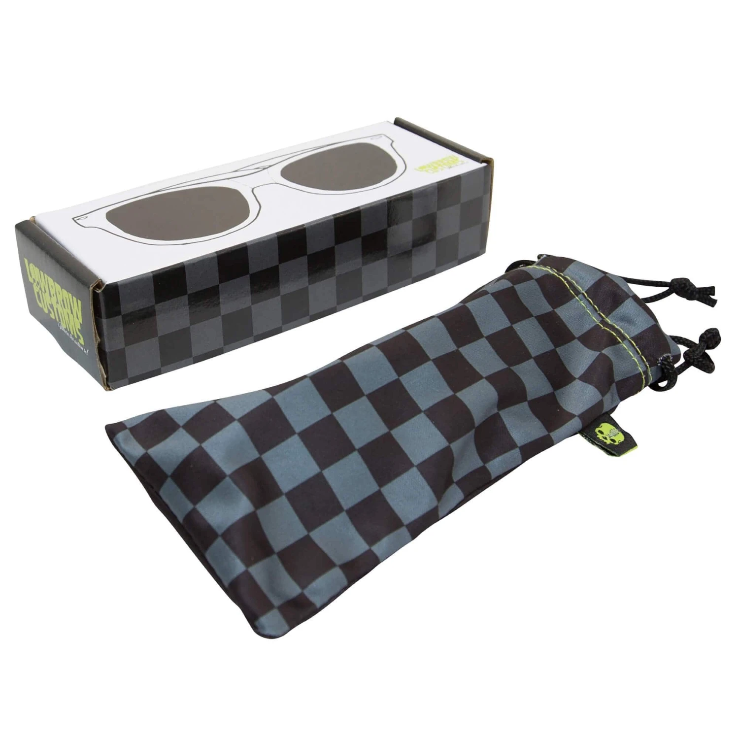 Lowbrow Customs sunglasses are ideal for riding your moto or jamming around town, regardless of mode of transport. They hold up to the daily rigors of the average 21st century S.O.B. while remaining reasonably-priced and oozing classic style. Quality touches like articulated spring hinges, small, raised Lowbrow Customs logos, and a subtle checkerboard imprint on the inside of the arms add style to substance. Micro-fiber storage pouch included. Flat black polycarbonate frame with UV400 dark grey polycarbonate lenses.