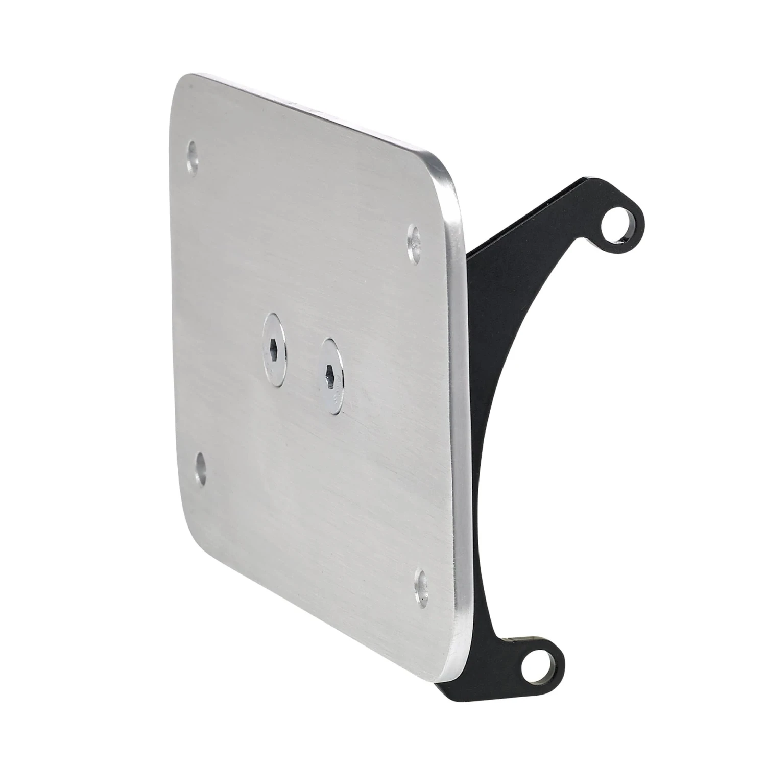 solutions we have seen for a Sportster. This mounts off the primary using the stock hardware. Just install the steel bracket (applying loctite to the bolts when re-installing) then attach the aluminum license plate bracket, either Vertical or Horizontal, with the supplied hardware. Super clean and tucked in. Made in Cleveland, Ohio USA.