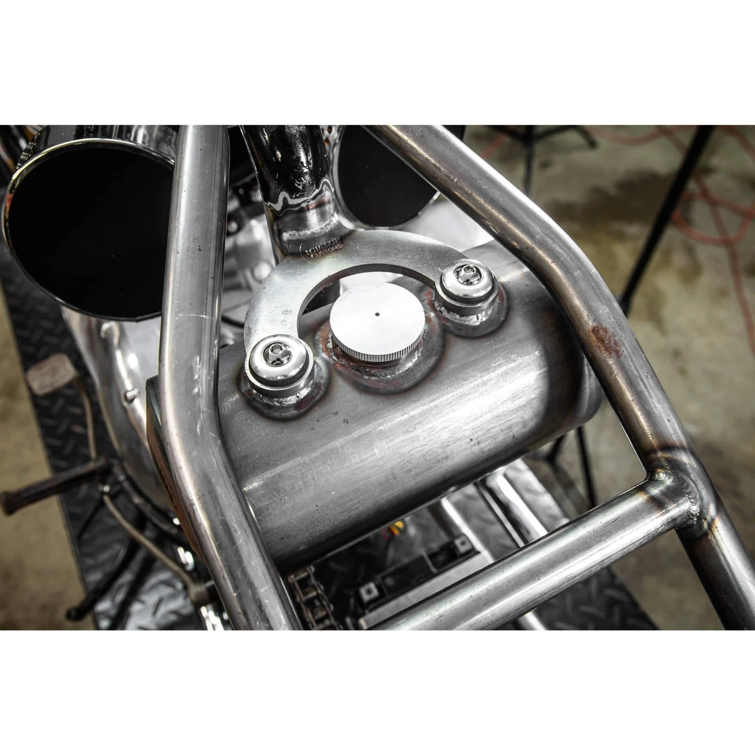 , and can be used on any motorcycle that has a vertical seat post. The included brackets are 1/4 inch thick mild steel and feature our innovative tophat spacers, 3 chrome button head allen 5/16″ X 18 TPI fasteners and rubber grommets to keep vibration from causing any damage to your oil tank or mounts. Both mounts are coped for the Triumph frame’s seat post tube. Bolt this mounting kit to your oil tank, hold in place against your frame and apply a number of tack welds to hold the brackets in place. Unbolt your oil tank so you can finish weld your brackets. That is it! Made in Ohio, USA.