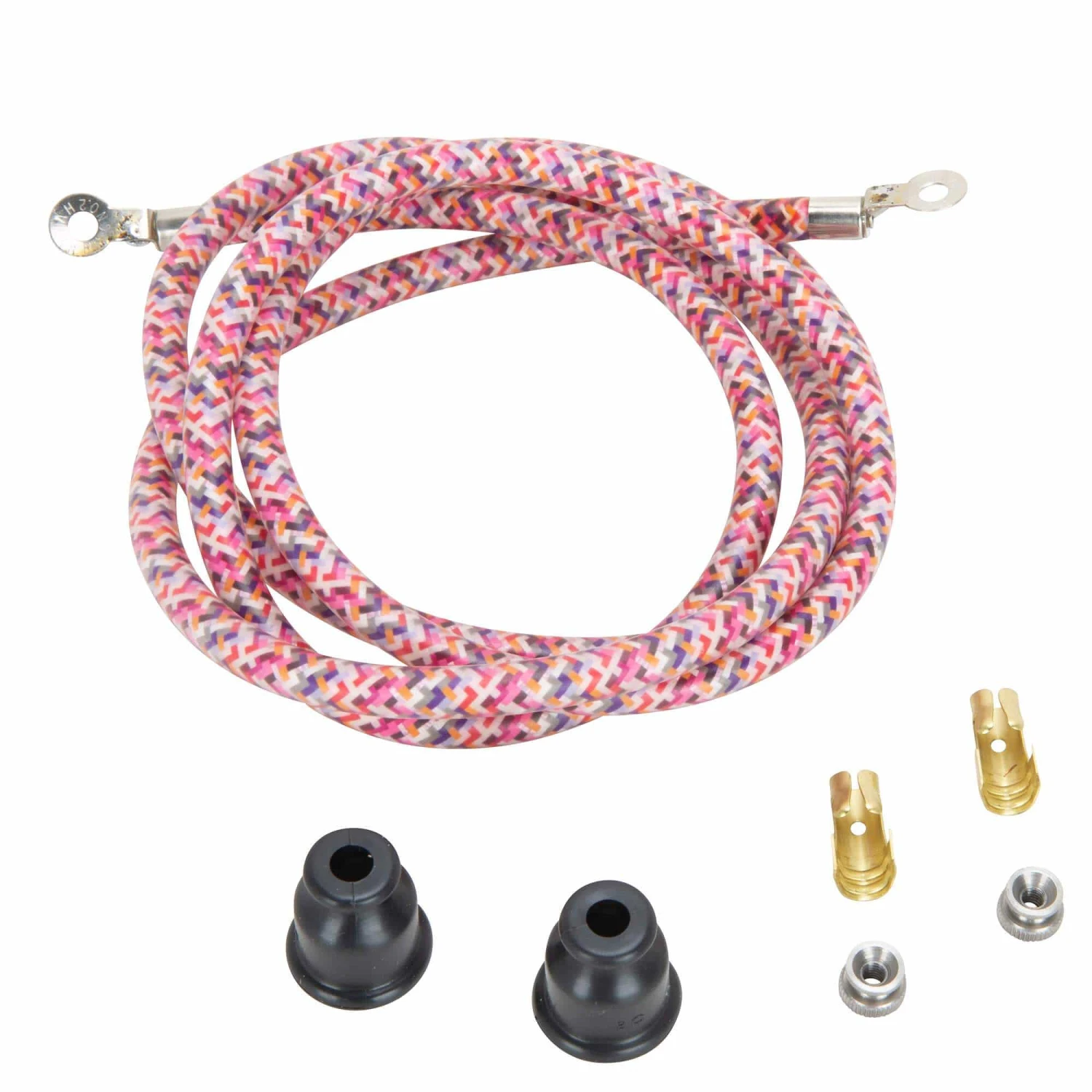 FNA Customs Cycle’s unique spark plug kits offer color ways that are a little different than anything else on the market. The rajah ends are soldered on for dependability, and the kit includes the knurled spark plug terminal nuts to positively attach them to the spark plugs. Each kit includes 5′ of stranded wire core spark plug wire, you just cut the wires to length, and install the included coil ends!